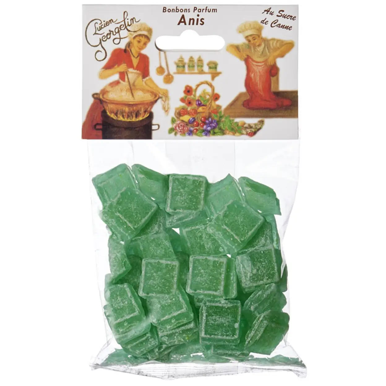 Sucre 62 %, sirop de glucose, colorants : E131 et E161b, arôme naturel d'anis 0,29 %.