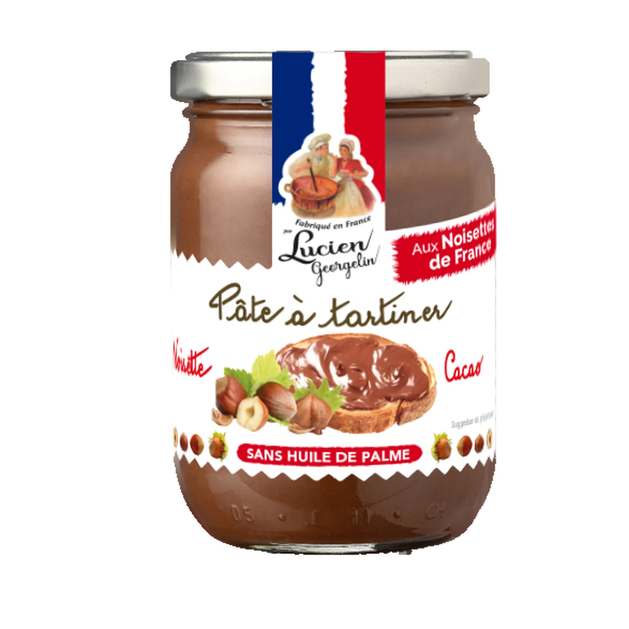 Sucre, huile de colza, noisettes entières 16% (origine France), poudre de lait écrémé, poudre de cacao maigre* 7%, émulsifiant : lécithine de tournesol.