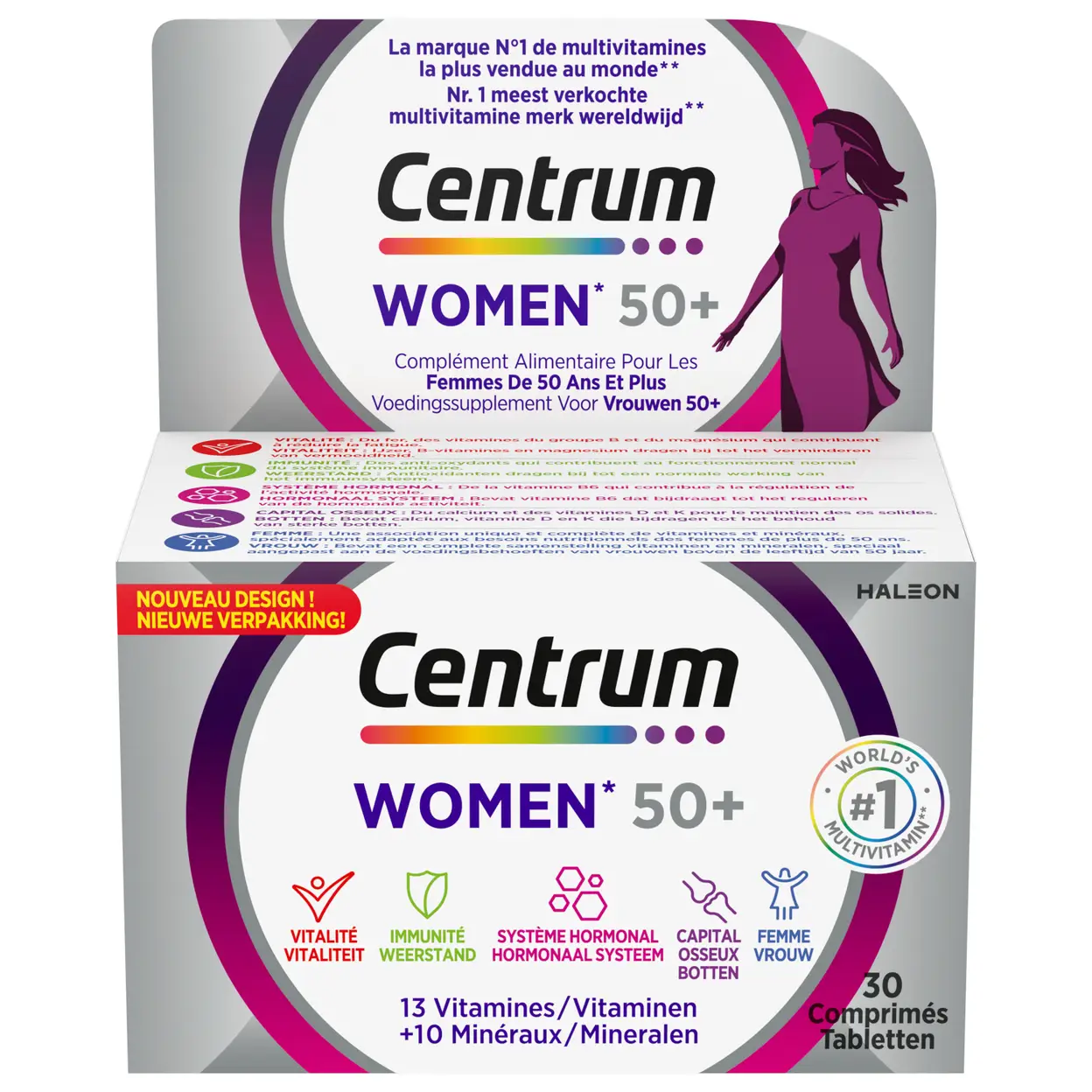 Centrum Women 50+ est un complexe multivitaminé unique scientifiquement adapté aux besoins spécifiques des femmes passées 50 ans. Il leur apporte tout ce dont leur corps a besoin pour rester en forme au quotidien. Ce complément Alimentaiire pour les Femmes de 50 Ans et plus est une association unique et complète de 13 vitamines et 10 minéraux, spécialement adaptés aux besoins nutritionnels des femmes de plus de 50 ans : Vitalité : Du fer, des vitamines du groupe B et du magnésium qui contribuent à réduire la fatigue. Immunité : Des anti-oxydants qui contribuent au fonctionnement normal du système immunitaire. Système Hormonal: De la vitamine B6 qui contribue à la régulation de l’activité hormonale. Capital Osseux : Du calcium et des vitamines D et K pour le maintien des os solides.