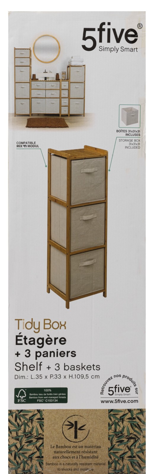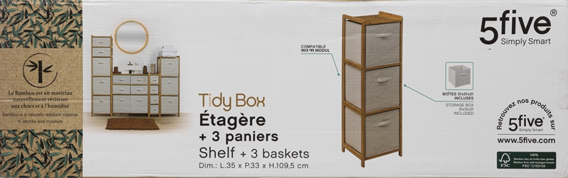 5FIVE Tidy Box Étagère avec 3 paniers en bambou - L.35 x l.33 x H.109,5 cm