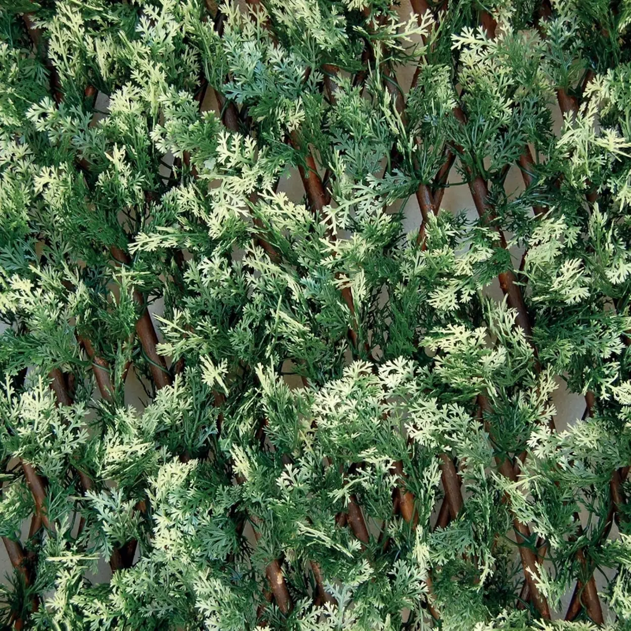 La clôture ouverte mesure 1 x 2 m. La haie artificielle TENAX DIVY 3D X-TENS avec feuilles en polyéthylène 3D sur un treillis extensible en osier naturel. Haie artificielle composée d'un treillis extensible en osier naturel avec feuilles en polyéthylène 3D, type cyprès.