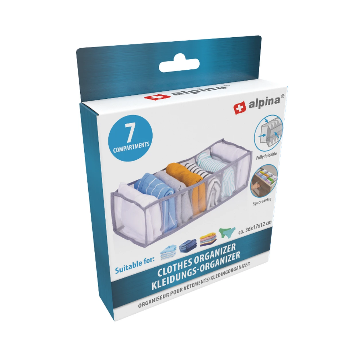 L'organisateur pour vêtements Alpina est conçu pour optimiser le rangement de votre garde-robe grâce à sept compartiments spacieux, parfaits pour organiser chemises, pantalons, sous-vêtements, accessoires et plus encore. Sa structure pliable permet de le ranger facilement lorsqu'il n'est pas utilisé, économisant ainsi un espace précieux dans les placards ou les tiroirs. Avec des dimensions compactes de 36 x 12 x 17 cm et une conception légère, cet organisateur est simple à manipuler et à repositionner selon les besoins. Que ce soit à la maison, en résidence étudiante ou en voyage, il offre une solution pratique pour maintenir l'ordre et l'accessibilité dans le rangement de vos vêtements.