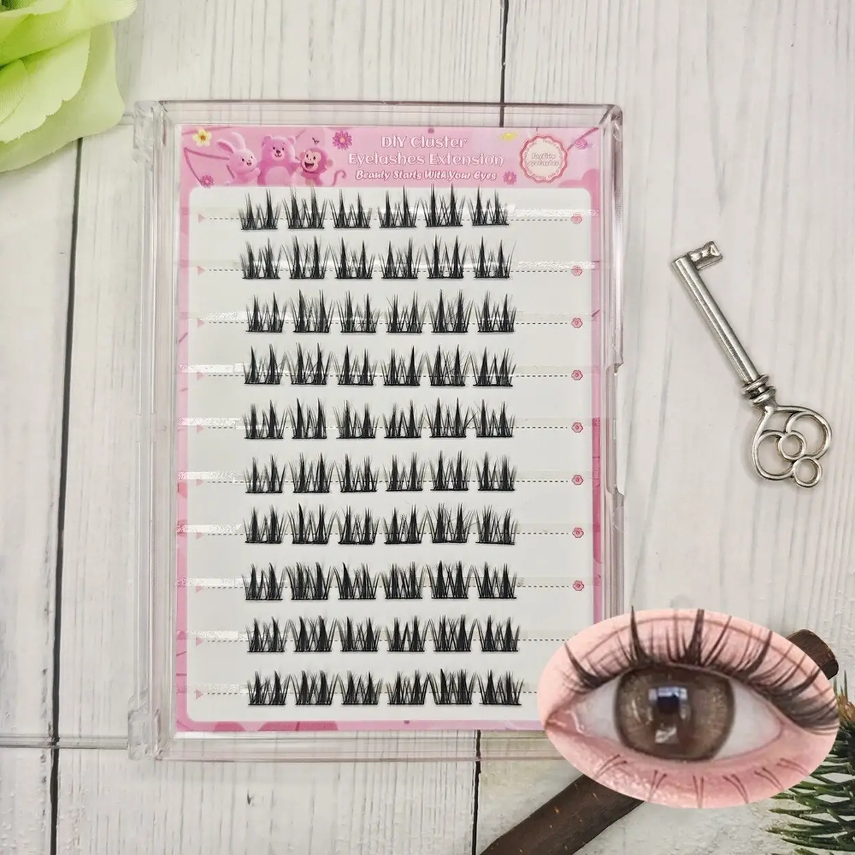 ④ Kit de cils pré-collés avec pinceaux 10 rangées : Comprend les bandes de cils pré-collées et une pince à application de précision. Aucun flacon de colle n'est nécessaire car l'adhésif est pré-appliqué.
