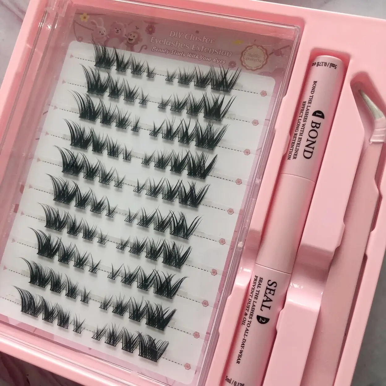 ④ Kit de cils pré-collés avec pinceaux 10 rangées : Comprend les bandes de cils pré-collées et une pince à application de précision. Aucune bouteille de colle n'est nécessaire car l'adhésif est pré-appliqué.