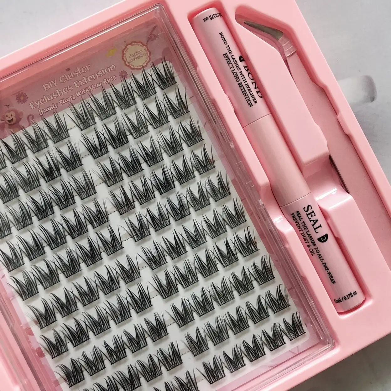 ④ Kit de cils pré-collés avec pinceaux 10 rangées : Comprend les bandes de cils pré-collées et une pince à application précise. Aucune bouteille de colle n'est nécessaire car l'adhésif est pré-appliqué.
