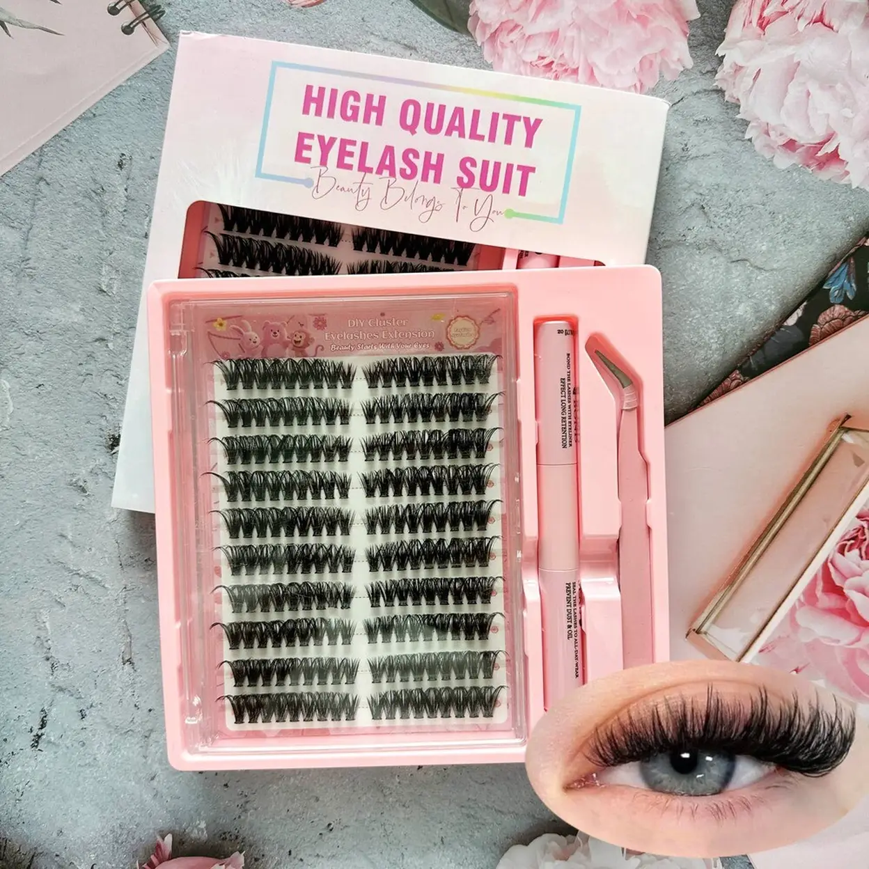 ③ Kit d'extensions de cils classiques avec pince & colle 10 rangs : Inclut les bandes de cils classiques, un flacon de colle à cils dédié et une pince d'application de précision. Un kit de démarrage complet.