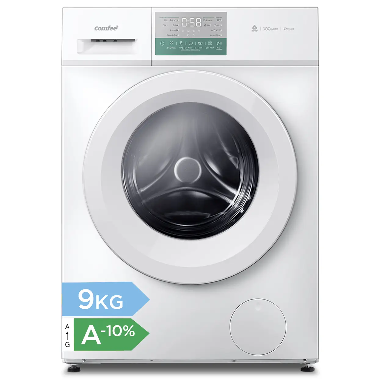 Comfee Lave-linge pose libre, 9 kg, classe énergétique A-10%, soin vapeur, moteur BLDC, certifié Woolmark, panneau tactile, blanc - CFP03EW90W-HR