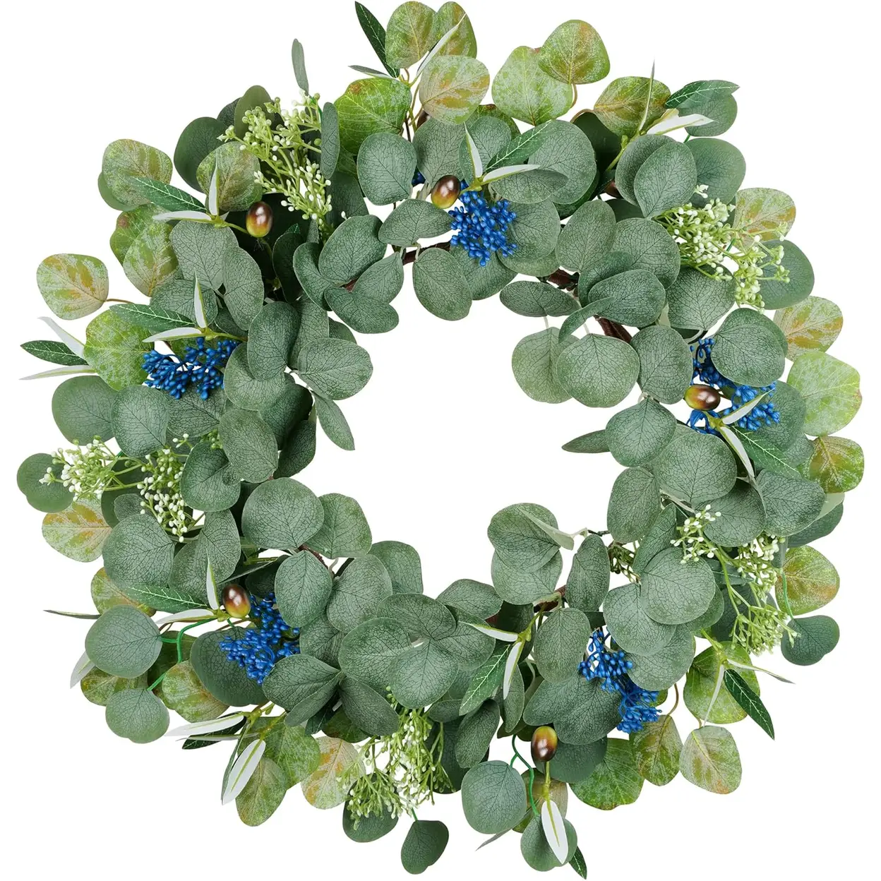 Richesse de la variété botanique : associe des feuilles d'eucalyptus, des feuilles d'olivier, des baies d'olivier et des baies blanches pour une apparence naturelle et texturée