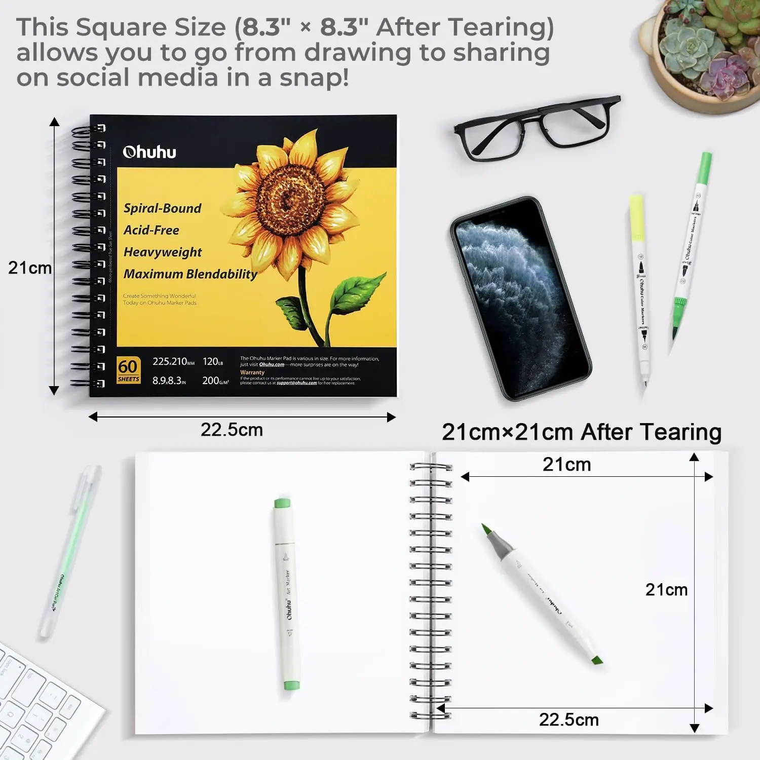 • Présente un format carré unique offrant 15 % d'espace de dessin en plus par rapport à un A5 standard, idéal pour les motifs symétriques, les vignettes de bande dessinée et les créations prêts pour les réseaux sociaux.