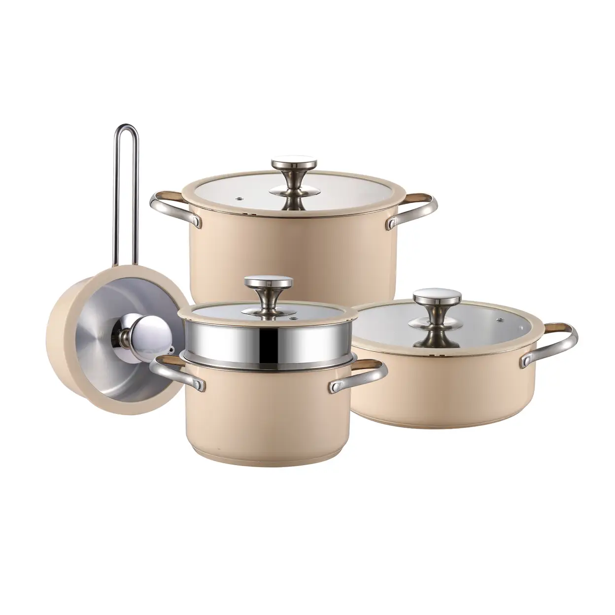 Série de batterie de cuisine PURECOOK en acier inoxydable 304 revêtu de céramique colorée Pot à lait 16 cm, Pot à soupe 18 cm avec insert vapeur, Pot chaud 22 cm, Pot à bouillon 24 cm - Revêtement céramique beige, Base multi-ply, Couvercle en verre silicone conducteur de chaleur, Acier inoxydable 304