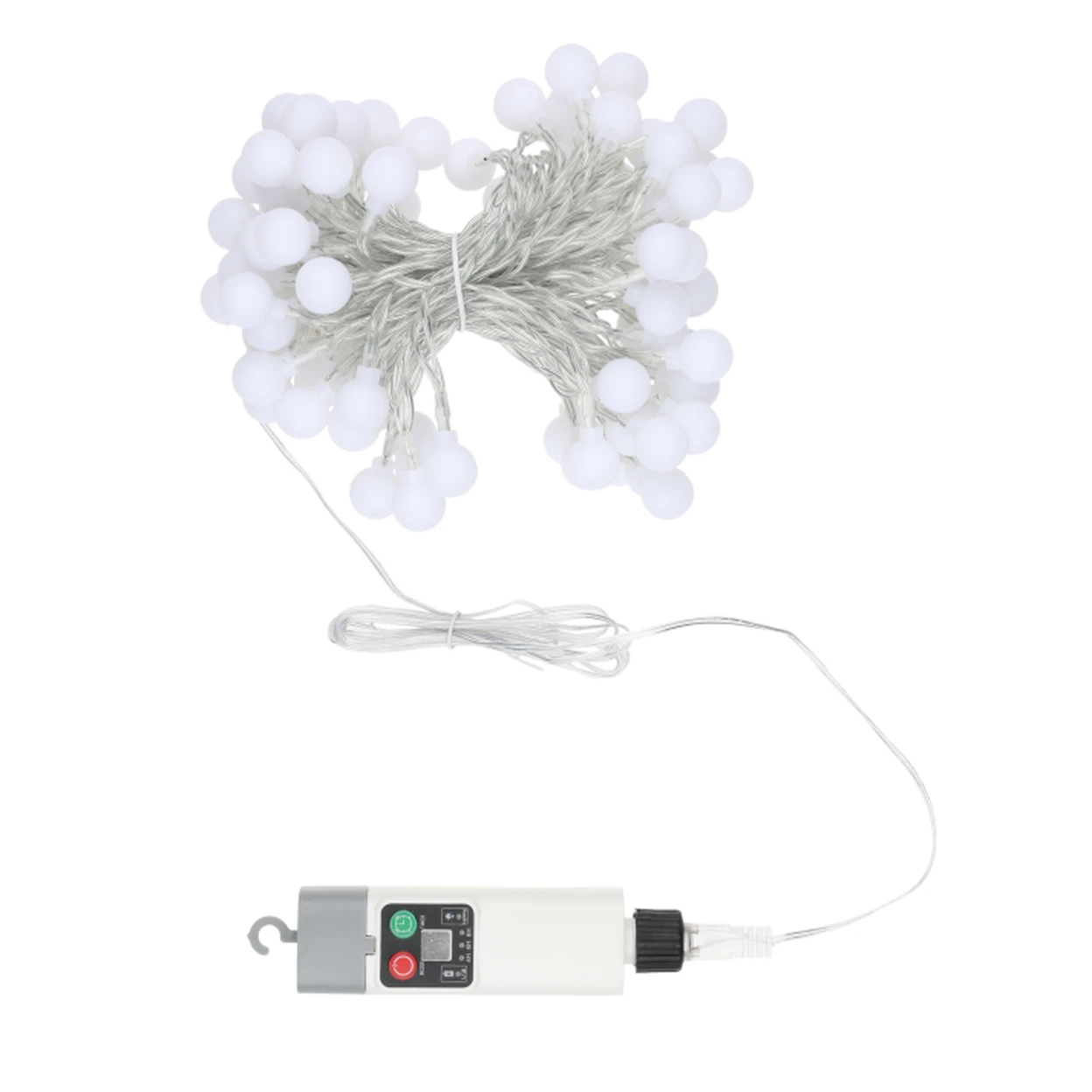Disponible en deux tailles : 5 m de longueur avec 50 lumières ou 10 m de longueur avec 100 lumières. Les deux versions sont alimentées par une batterie au lithium 18650 de 800 mAh avec capacité de chargement USB.Les petites boules mesurent environ 10 mm de diamètre, espacées uniformément le long du fil fin à 2 lignes. Les LED blanc chaud émettent une température de couleur constante de 2700 K.L'autonomie de la batterie varie de 6 à 12 heures selon le mode d'éclairage sélectionné, et une charge complète prend environ 3 à 4 heures.