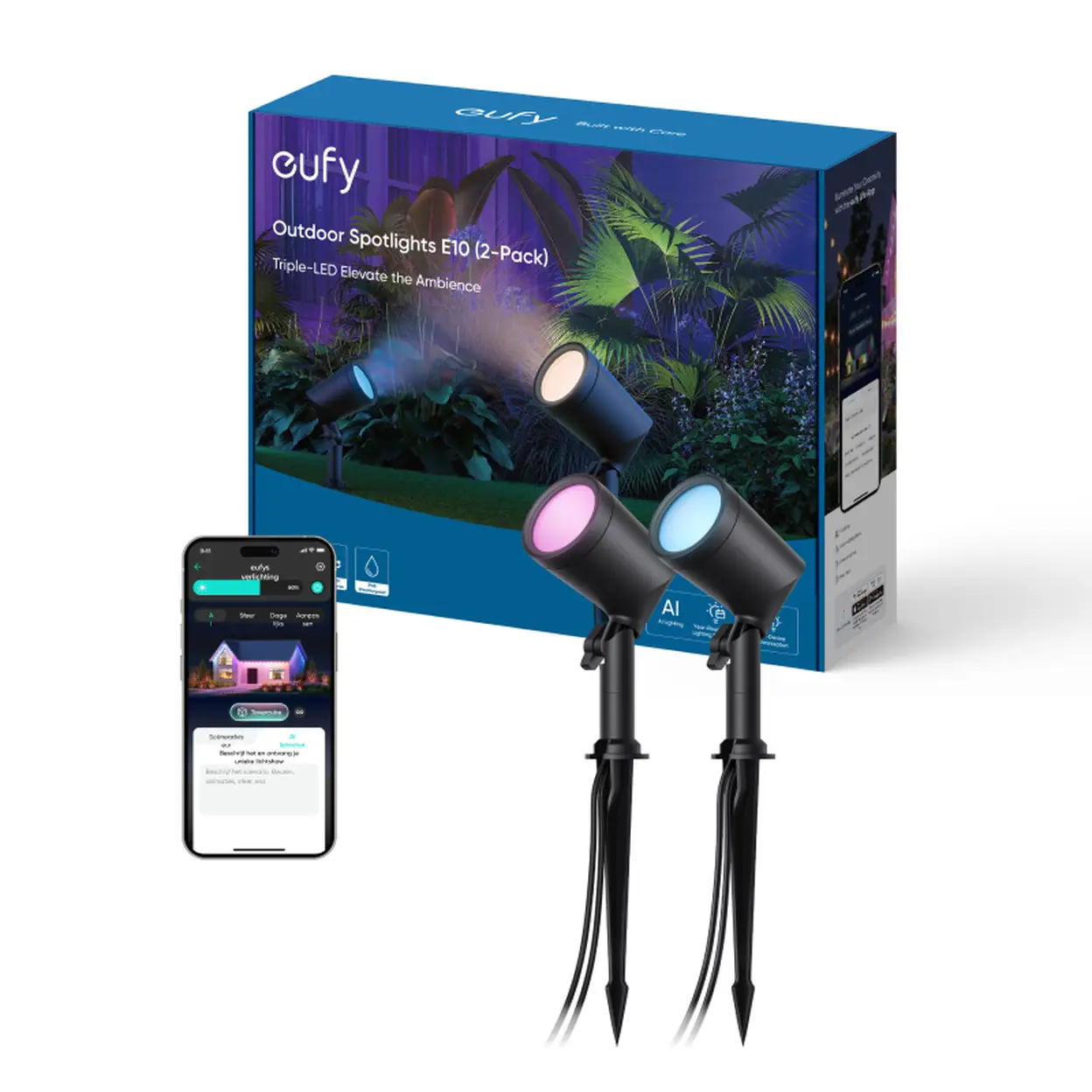 Projecteur Extérieur eufy E10 Lot de 2, projecteurs LED RGBWW filaires intelligents, étanches IP65 pour jardin et terrasse, contrôle par Alexa et application, modes d'éclairage IA polyvalents pour fêtes, liaison avec caméras