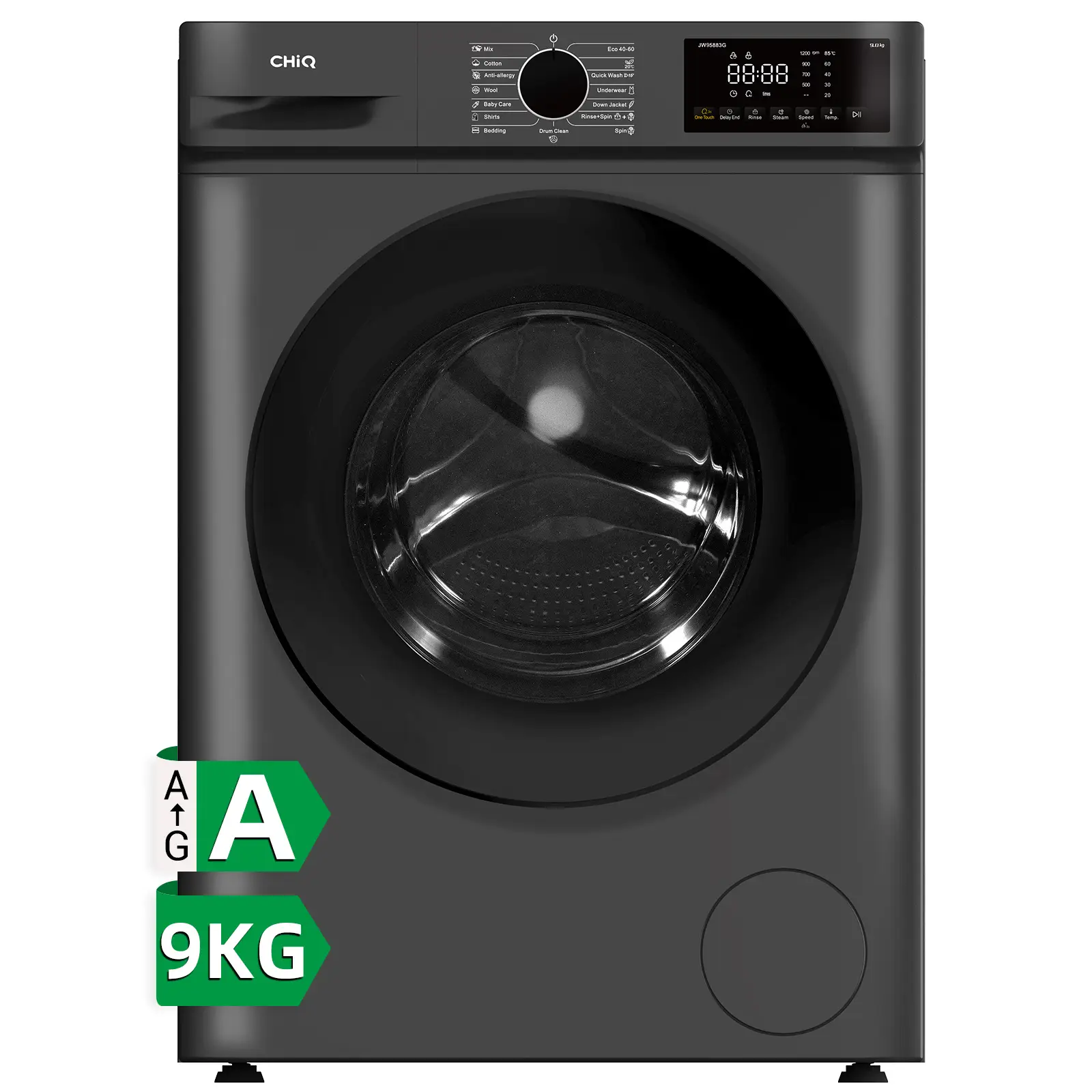 CHiQ Lave-linge frontal JW95883G, 9 kg, tambour 530 mm, moteur BLDC 1400 tr/min, fonction vapeur, rapide 15 min, largeur 465 mm, gris foncé