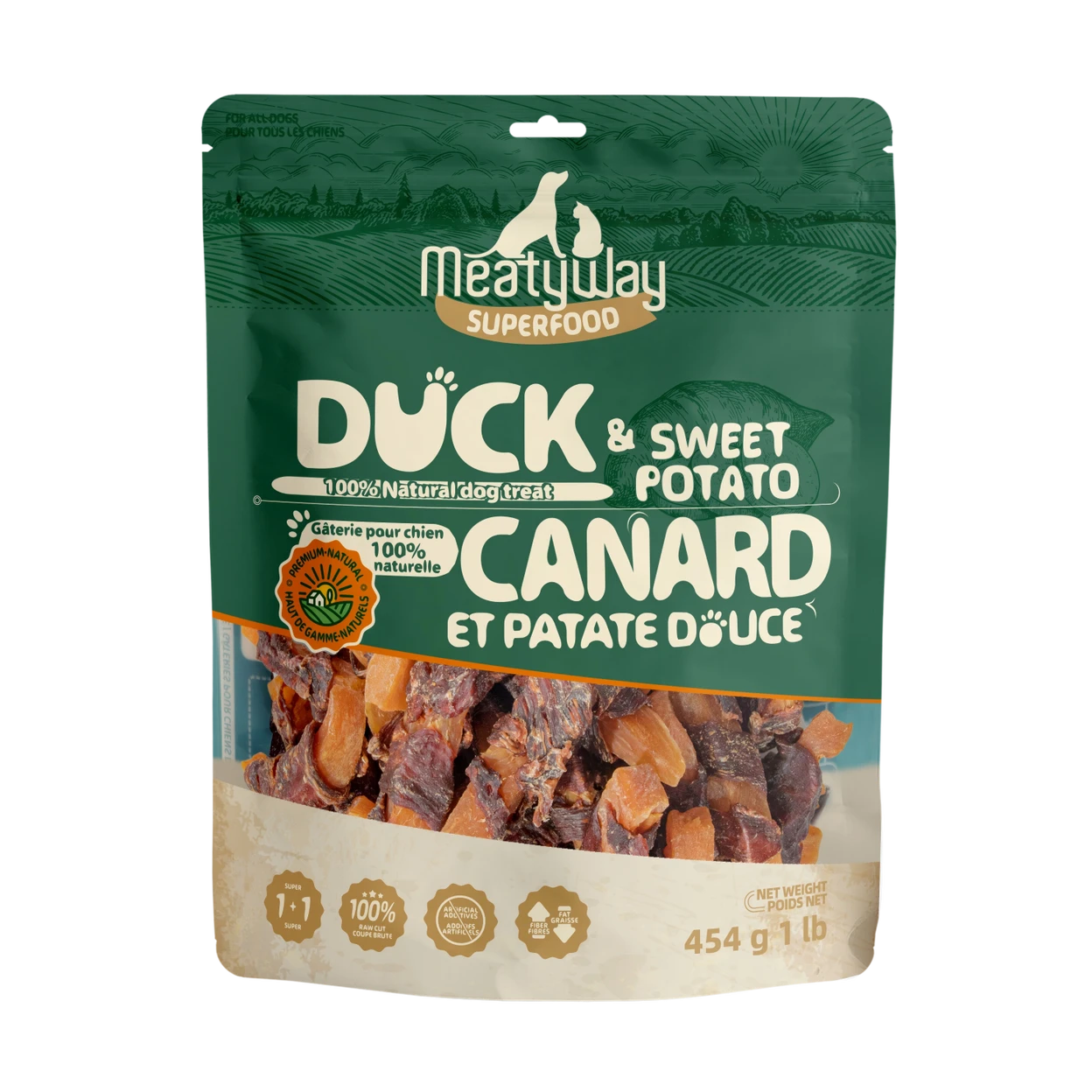 Ces friandises de viande séchée sont élaborées avec du canard véritable de haute qualité et de la patate douce nutritive, offrant une recette saine et simple. Ils conviennent aux chiens. Le poids net de ce produit est de 454 g. Pour la conservation, veuillez le placer dans un endroit frais et sec.