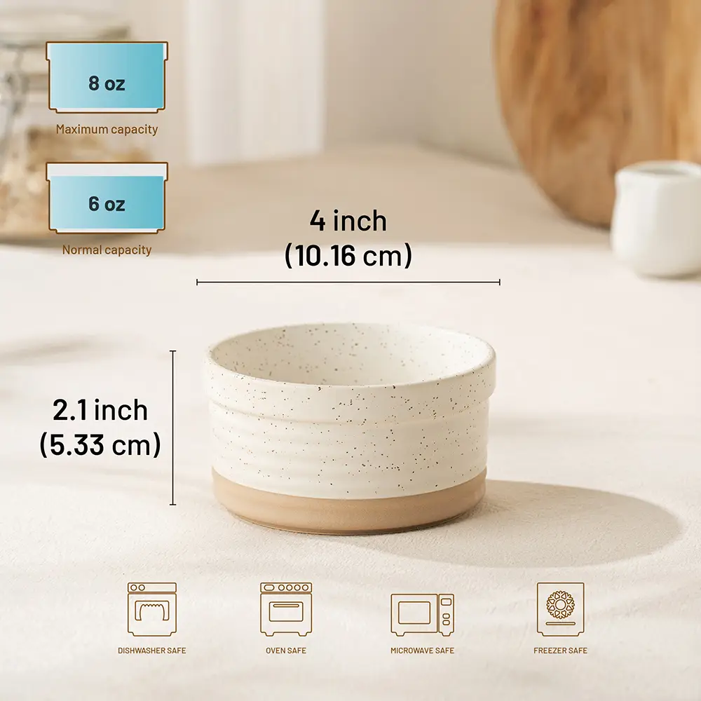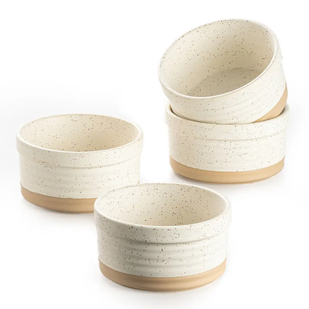 Ces ramequins sont fabriqués en céramique de haute qualité, sans plomb et non toxique, dotés d'un glaçage durable et résistant aux rayures, et produits selon les normes de sécurité pour le contact alimentaire, garantissant une performance fiable pour cuire, servir et conserver.Liste complète des matériaux : Céramique, glaçure. Aucune allégation environnementale trompeuse : Aucune certification environnementale spécifique n'est revendiquée pour ce produit. Avertissement spécial : Ce produit n'est pas fabriqué en bois massif. Le matériau principal est la céramique.