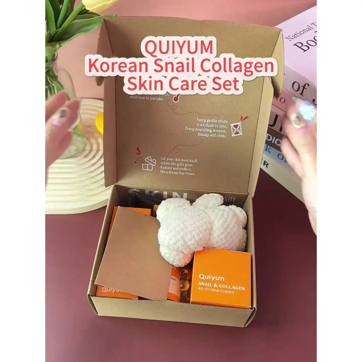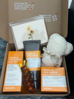 Quiyum Kit de soins visage au collagène d'escargot coréen (5 pièces) - Nettoyant visage 100 g, tonique 100 ml, crème visage 50 g, avec serviette ourson, peigne de massage facial, cadeau Fête des Mères