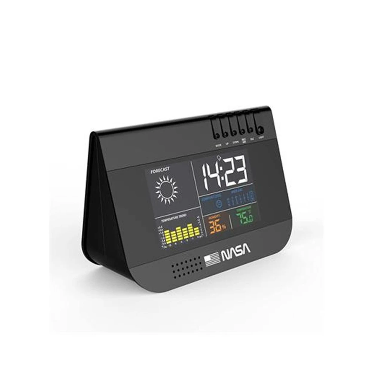La station météo NASA WS100 est une station météo moderne noire conçue pour fournir des informations météo et horaires complètes d'un seul coup d'œil. Dotée d'un grand écran couleur facile à lire, le WS100 affiche des prévisions météo en temps réel, des tendances de température, des niveaux d'humidité et l'heure. Son design compact triangulaire s'intègre parfaitement dans n'importe quelle pièce, que ce soit à la maison ou au bureau. L'interface intuitive et les icônes claires permettent de surveiller facilement les conditions intérieures et de planifier votre journée avec confiance. Avec son look élégant et ses fonctions pratiques, la NASA WS100 est un ajout idéal à tout espace moderne.