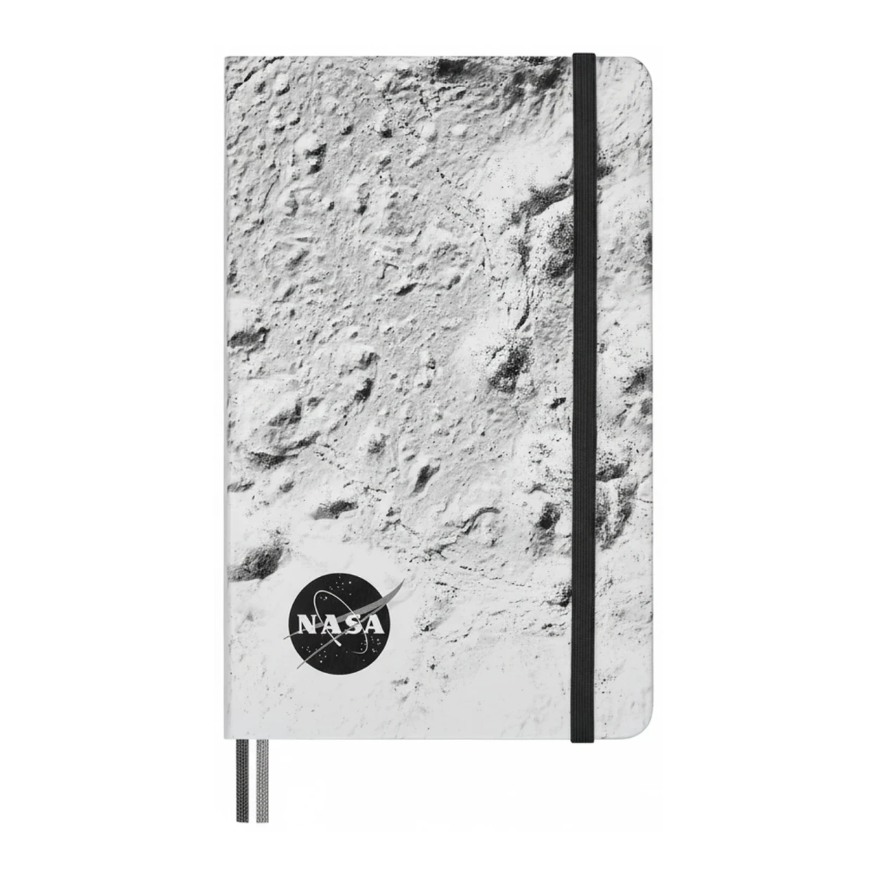 • Grand carnet à couverture souple (A5) au motif unique de surface lunaire, avec coins arrondis, fermeture élastique et marque-page assorti.