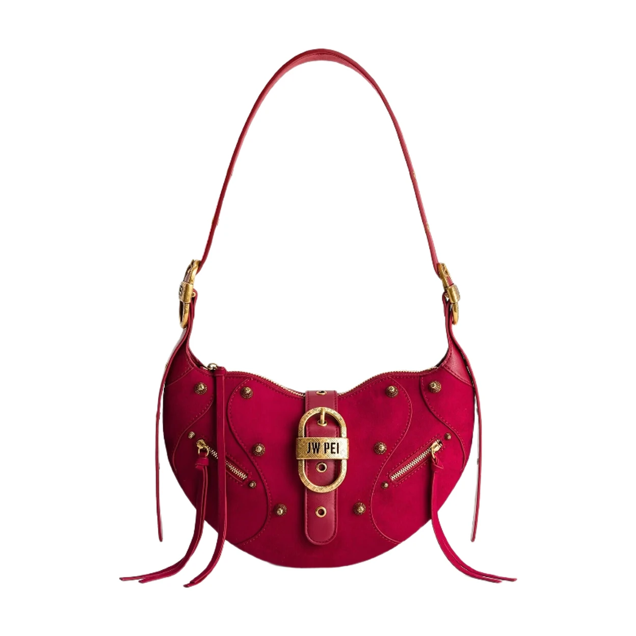 Le sac à bandoulière en daim Tessa de JW PEI en magenta profond offre une expérience tactile riche grâce à sa construction en fausse suédine de luxe. Ce sac à bandoulière polyvalent combine une texture douce et élégante avec un design fonctionnel, doté d'une sangle réglable et de finitions en or antique pour un charme vintage inspiré.