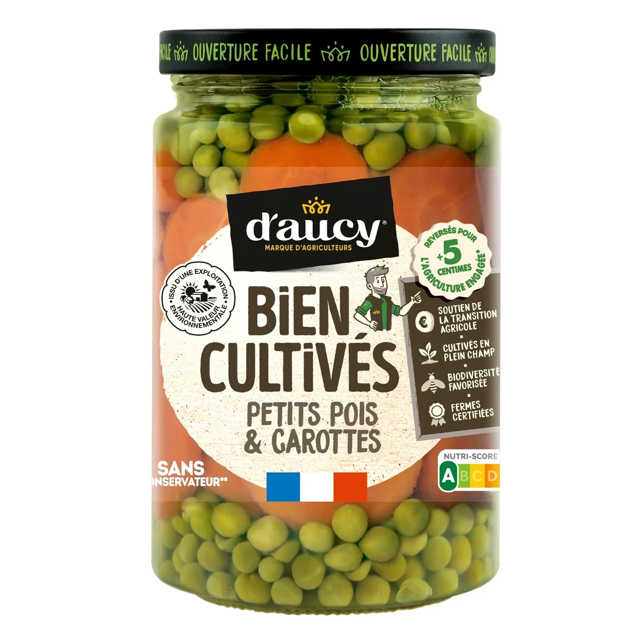Les Petits pois et carottes Bien Cultivés D’AUCY sont cultivés en plein champ en France, récoltés en saison et à maturité optimale. Ils proviennent d'une ferme certifiée Haute Valeur Environnementale, garantissant des pratiques agricoles qui préservent l'écosystème naturel et l'environnement. Ces petits pois et carottes sont un choix délicieux et nutritif pour tout repas.