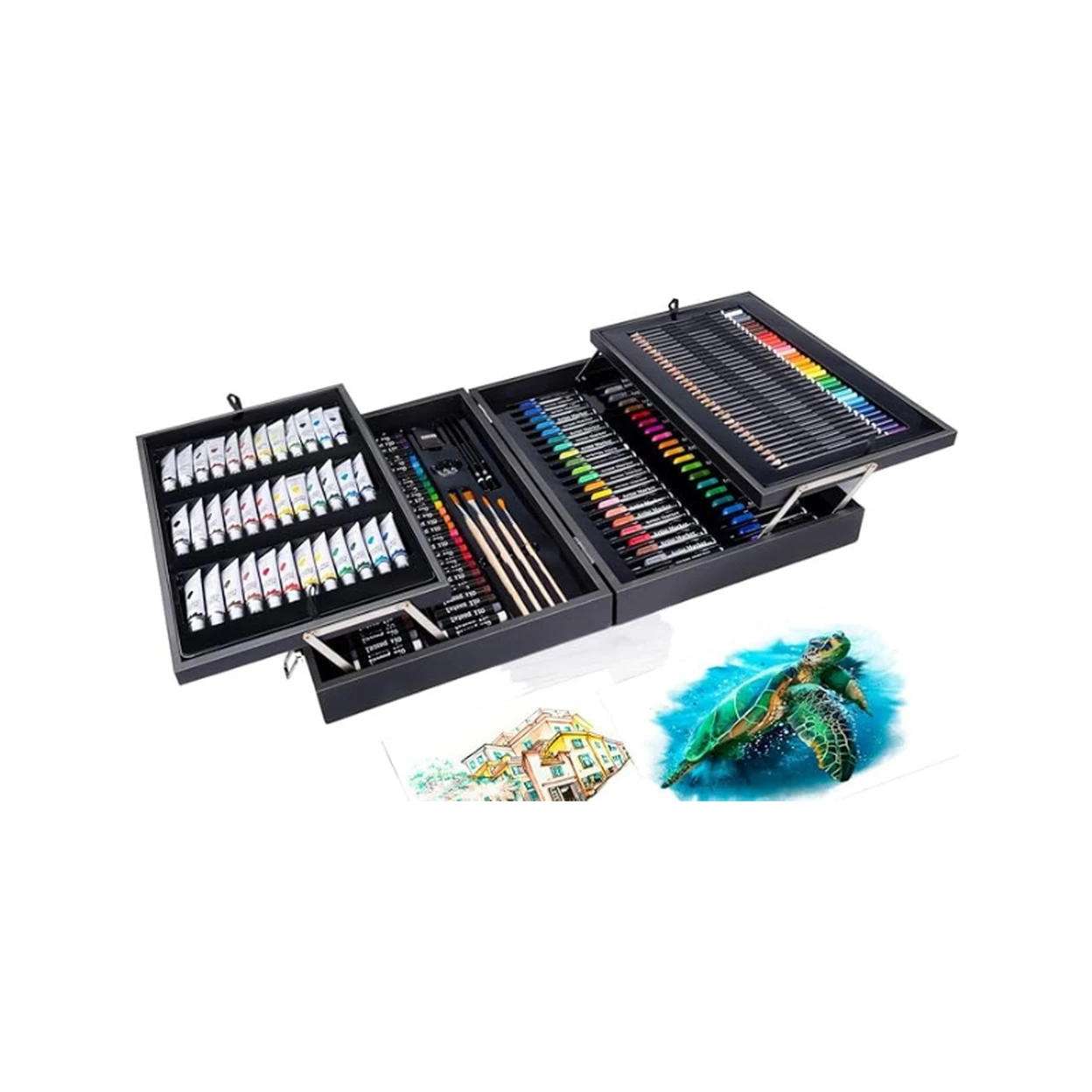 Cet ensemble complet est fabriqué à partir de pigments et de matériaux de construction de haute qualité, garantissant que chaque medium — des tubes de peinture de 12 ml aux crayons HB de précision — répond aux normes professionnelles.La finition met l'accent sur une coque en bois durable, laquée d'un noir élégant, offrant une protection professionnelle aux éléments fragiles qu'elle renferme.Les compartiments intérieurs sont moulés avec précision pour maintenir solidement chacun des 174 accessoires, dont 54 pastels à l'huile et 42 crayons de couleur, garantissant qu'ils restent organisés pendant le transport.Cette fabrication de qualité professionnelle fait de l'ensemble un investissement fiable à long terme pour tout espace de travail créatif.