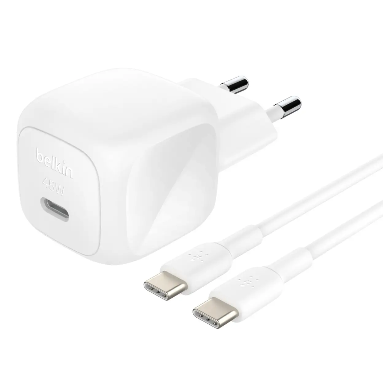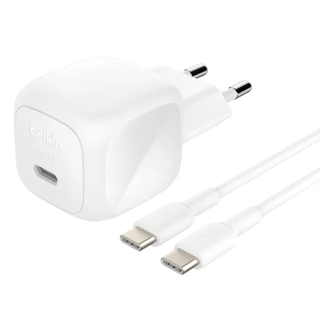 Belkin BoostCharge Chargeur secteur compact avec câble USB-C vers USB-C, 45 W - Blanc