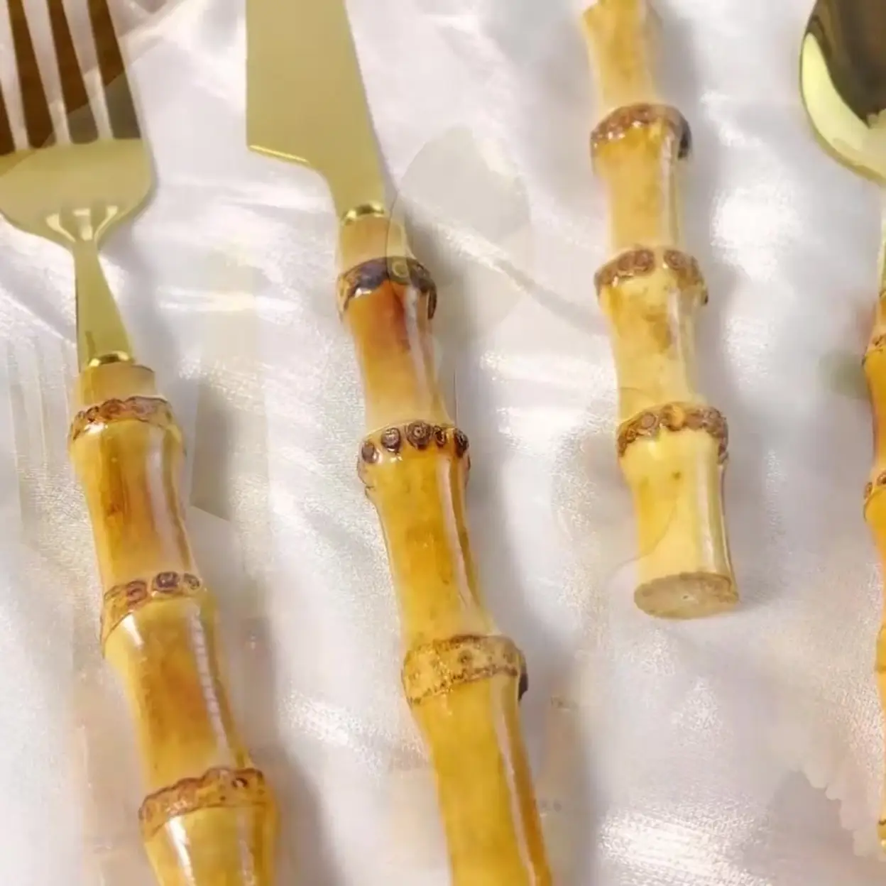 Fangyuan Set de 4 couverts en acier inoxydable compatible lave-vaisselle - Or + Manche bambou