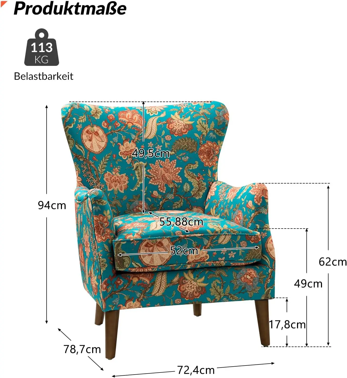 Fauteuil de salon confortable HULALA HOME à oreilles et accoudoirs à l’anglaise, tissu jacquard fleuri, pieds en bois massif