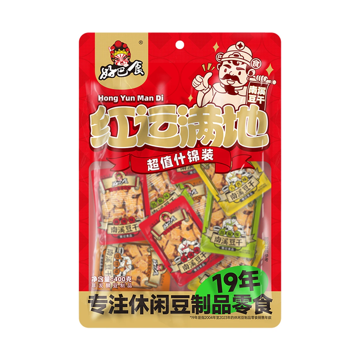 Hao Ba Shi Tofu séché - saveurs mala (épicée et picotante), barbecue, cinq épices et piments marinés - Assortiment économique Red Fortune - 400 g