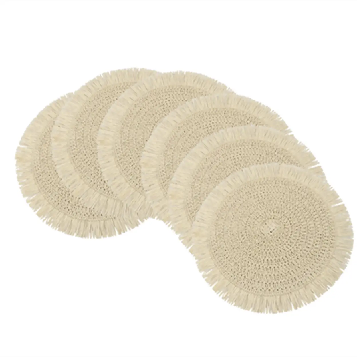 Lot de 6 set de table tressés en papier avec frange, style bohème, diamètre de 38 cm - Beige
