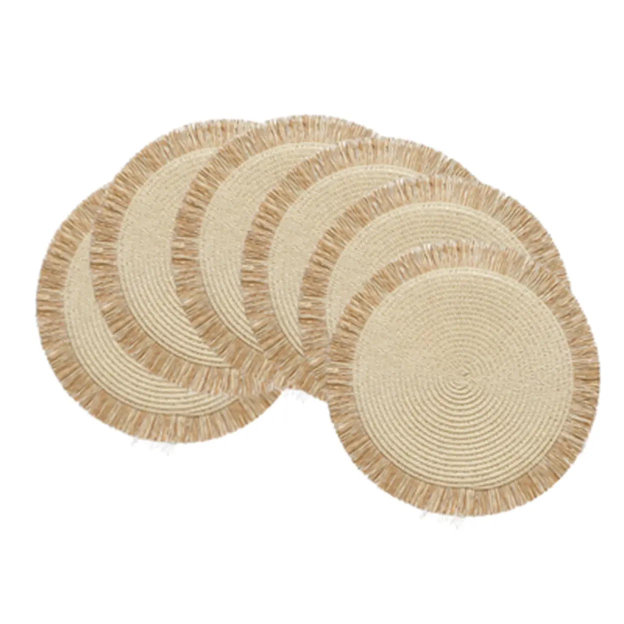 Lot de 6 sets de tables ronds tressés avec frange, style bohémien, diamètre 38 cm - Beige