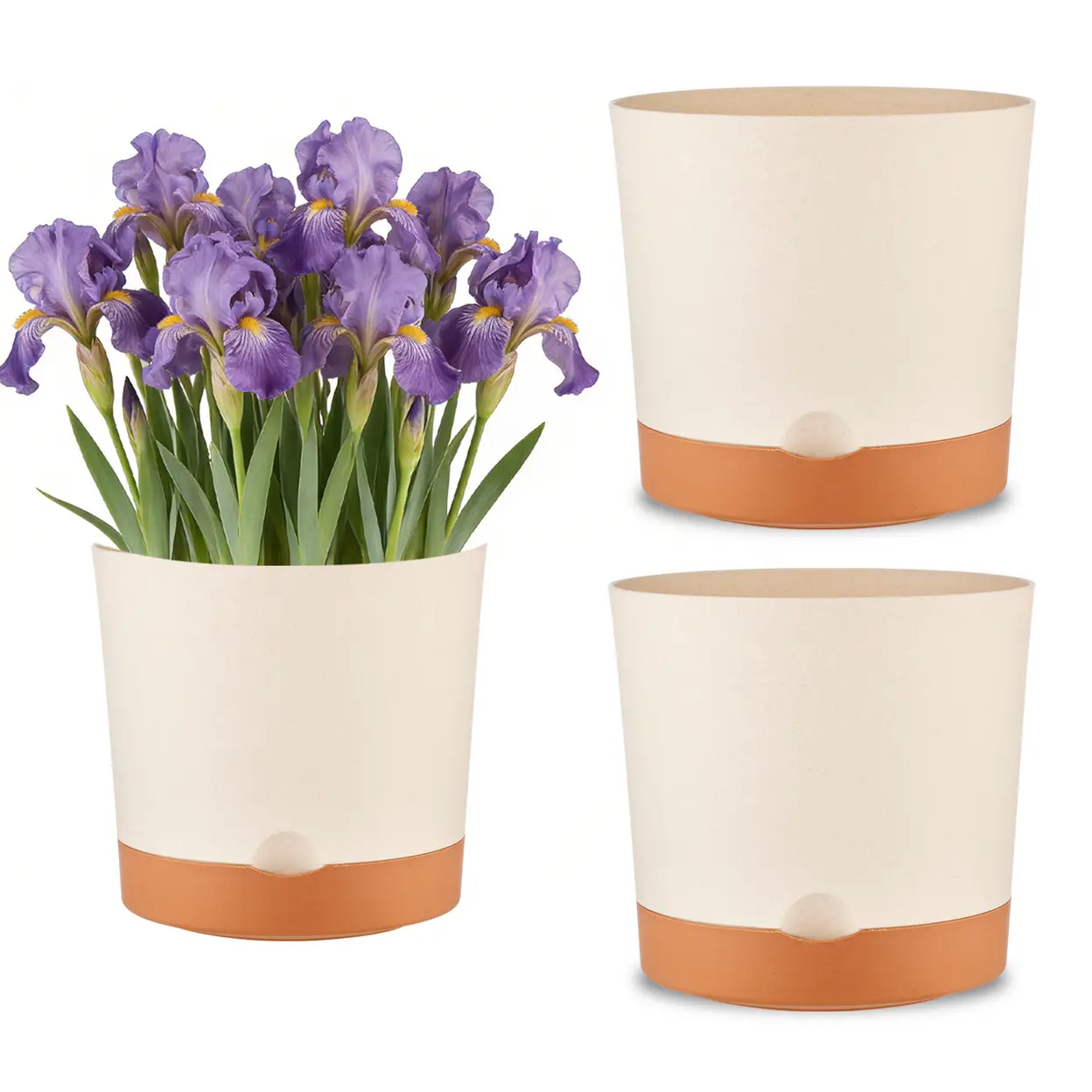 Ces pots sont fabriqués en plastique durable et de haute qualité avec une finition beige mate. La base auto-amorçante intégrée et les plateaux assortis sont conçus pour la durabilité et des performances constantes.