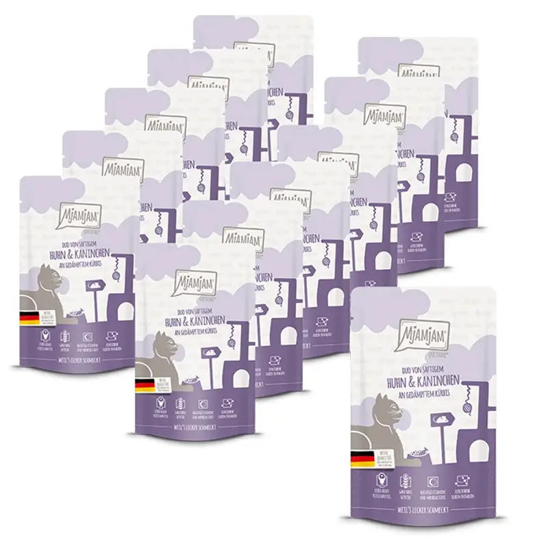 MjAMjAM - Nourriture pour chat - Quetschie - Duo de poulet et de lapin succulents avec potiron cuit à la vapeur - 12 x 125 g