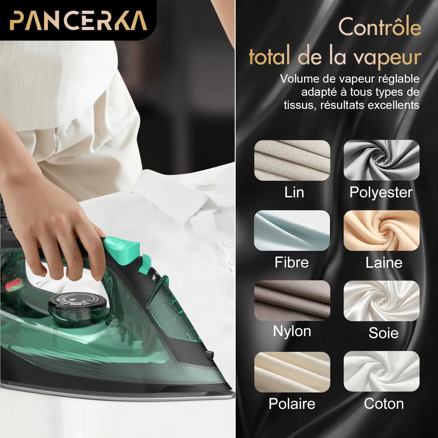 PANCERKA Fer à repasser vapeur puissant 1600 W, semelle en acier inoxydable durable, câble rétractable, chauffe rapide pour un entretien des vêtements en toute sécurité et facilement