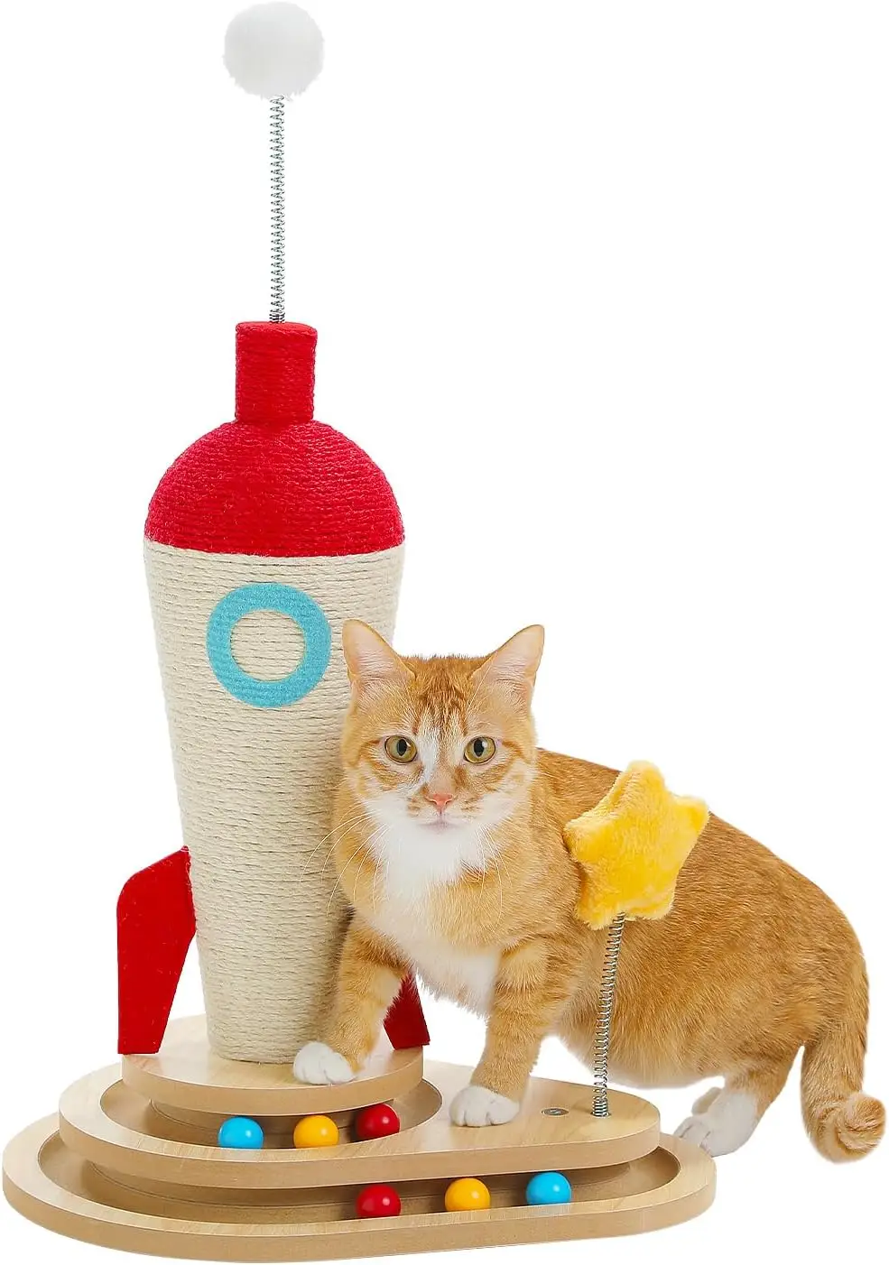 PAWZ Road Jouet interactif pour chats multifonction, griffoir en forme de fusée en sisal et parcours à billes en bois massif - 43 cm x 43 cm