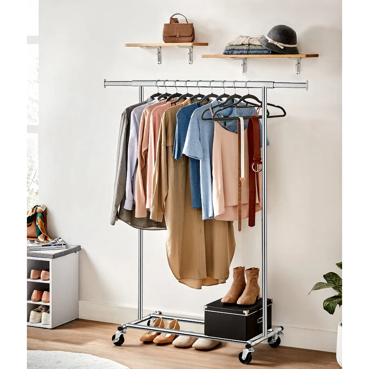 Porte-vêtements robuste avec roulettes, capacité de charge jusqu'à 90 kg, avec tige à vêtements escamotable, étagère pliable pour boîtes, 132 x 45,4 x 160 cm, Argenté