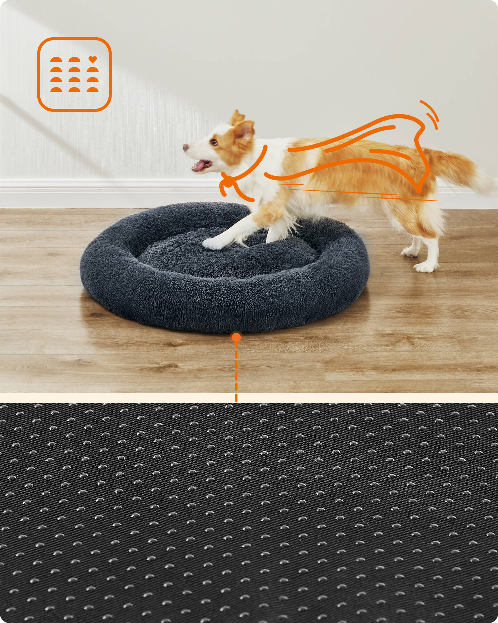 Le lit pour chien donut moelleux et apaisant SONGMICS HOME de 90 cm est conçu pour offrir à votre animal un sentiment de sécurité et de chaleur.L'appui central arrondi imite la sensation de s'adosser à un autre animal, aidant à réduire le stress et à encourager un sommeil plus profond et plus réparateur.L'ensemble du matelas est généreusement rembourré de coton PP de qualité supérieure, qui conserve sa forme moelleuse même avec une utilisation quotidienne, offrant un soutien doux aux articulations et aux muscles.La housse extérieure amovible dispose d'une fermeture éclair dissimulée pour un retrait rapide — il suffit de l'ouvrir et de la laver en machine pour maintenir un environnement de sommeil frais et hygiénique.Le tissu en peluche doux est délicat pour les peaux sensibles, tandis que la finition gris foncé ajoute une touche sophistiquée à n'importe quelle pièce. Aucun stockage spécial n'est nécessaire ; placez-le simplement dans un endroit calme à l'intérieur, éloigné de l'humidité directe.