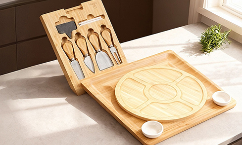 Plateau à Fromage en Bambou Zimatic avec Ensemble de Couteaux à Fromage, Planche Charcuterie et Plateau de Service, avec Plateau à Fruits, Idéal pour Vin, Biscuits, Brie et Viandes, Cadeau de Crémaillère ou pour Noël et Thanksgiving